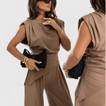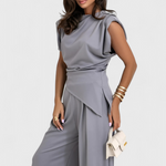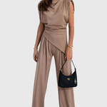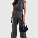 Escultural, refinado y con una presencia contemporánea, el conjunto Sofia une un top asimétrico de hombros drapeados con pantalones de pierna ancha para una silueta que alarga y fluye con elegancia. El tejido de caída ligera y sutil brillo aporta sofisticación, convirtiéndolo en una elección ideal tanto para eventos especiales como para elevar looks diarios con distinción.