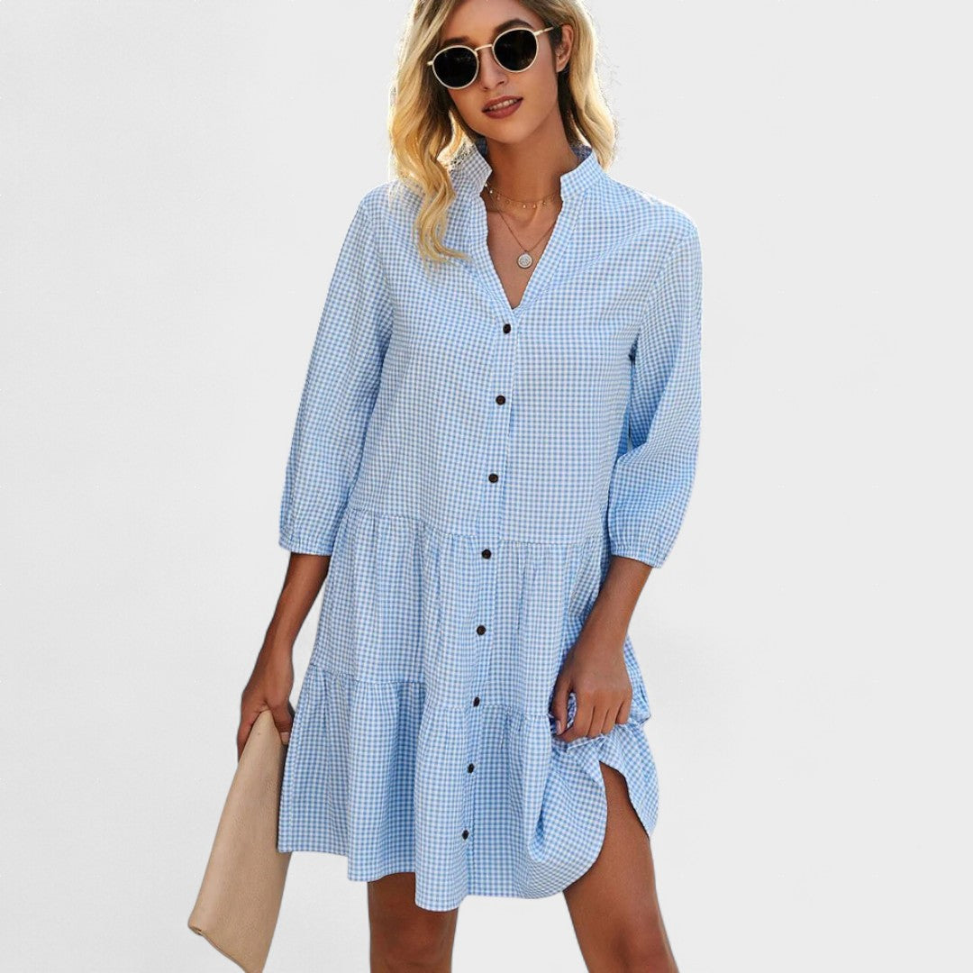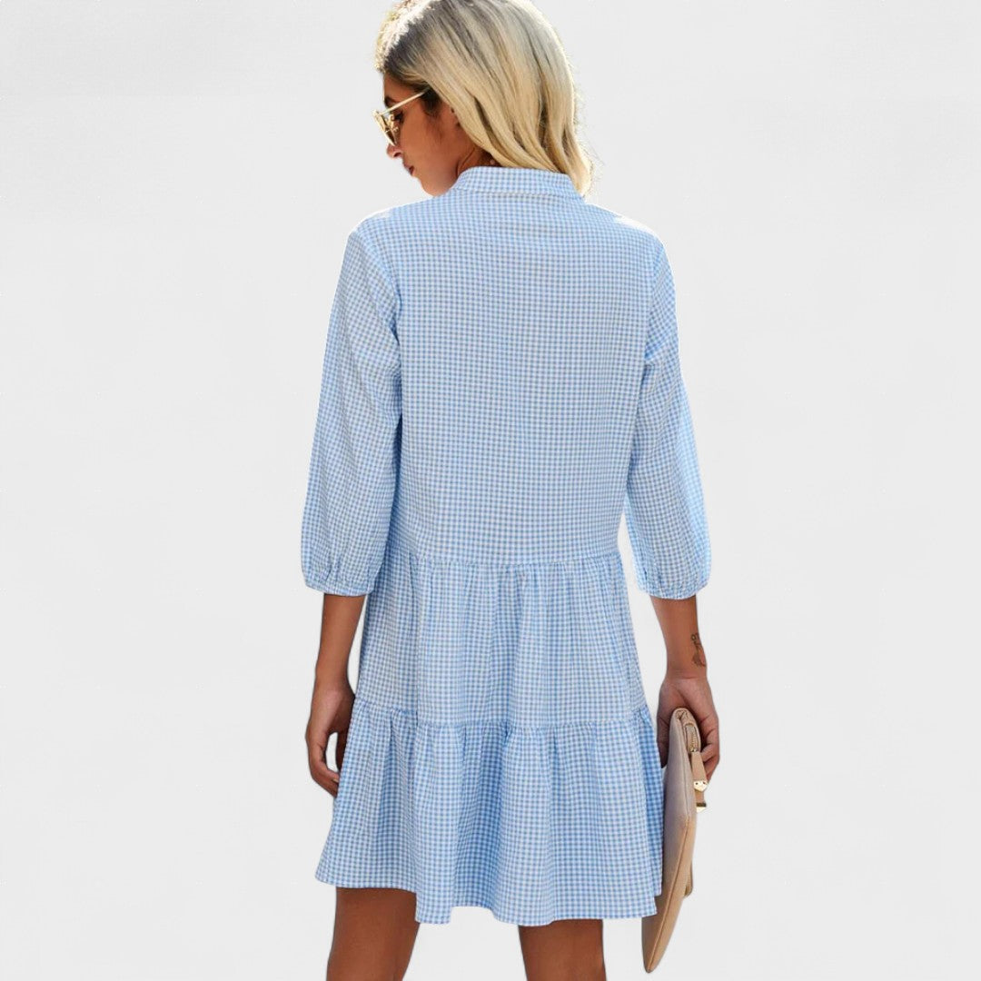Su estampado de cuadros azul y blanco evoca un estilo vintage renovado, mientras que su tejido transpirable y silueta fluida te mantienen fresca y segura durante todo el día.