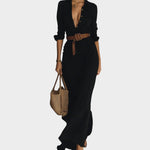El cinturón ajustable realza la cintura, mientras que el escote en V con botones aporta un toque femenino y versátil. Perfecto para cualquier ocasión, desde un día de trabajo hasta una cena elegante.