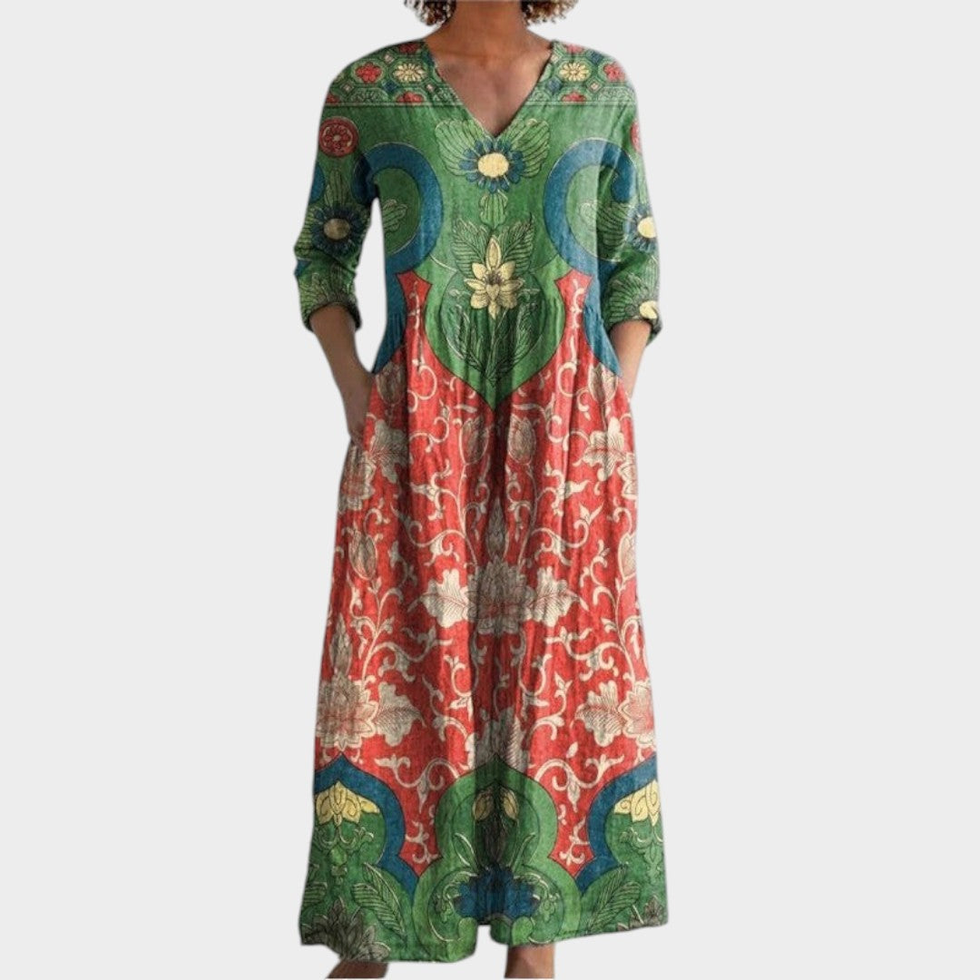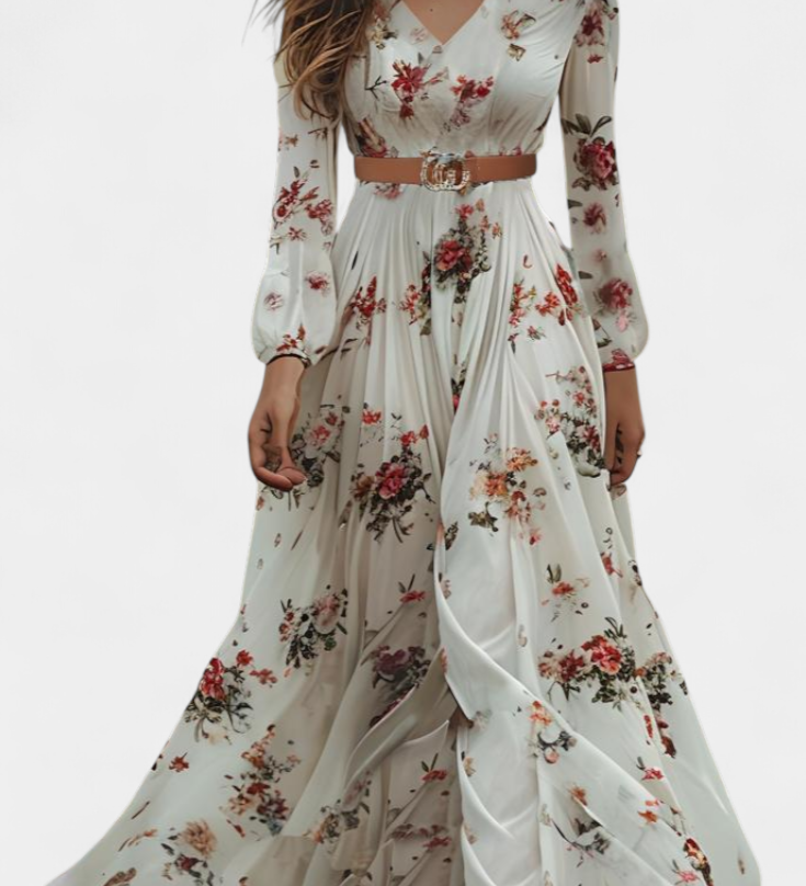 AMANDA – Vestido Maxi Floral con Cuello en V y Mangas Largas