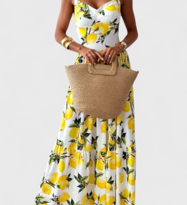 HUDA – Vestido Maxi Estampado de Limones con Tirantes y Abertura Lateral