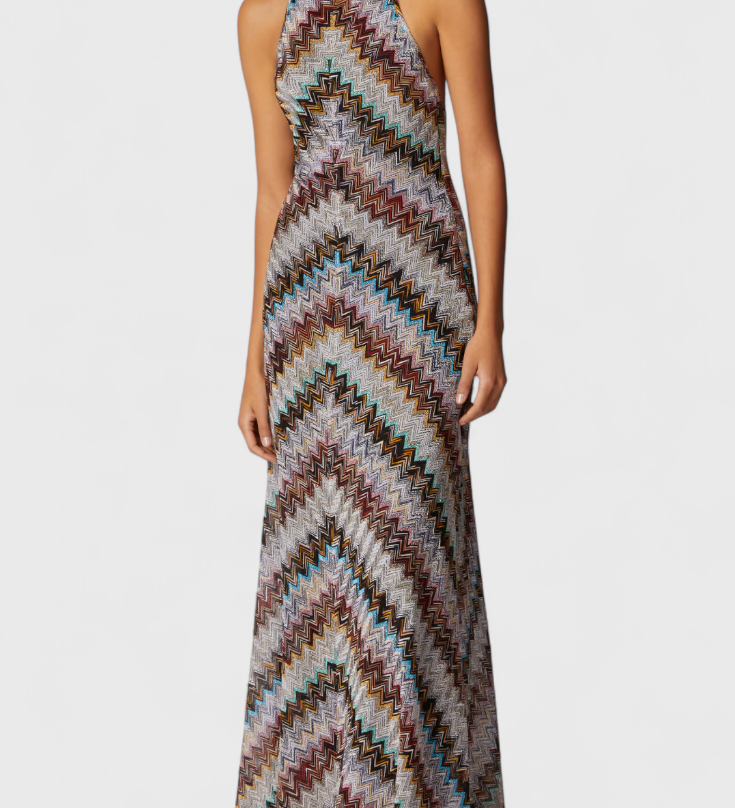 MELISA – Vestido Largo Halter con Zigzag Lamé y Acabado Iridiscente