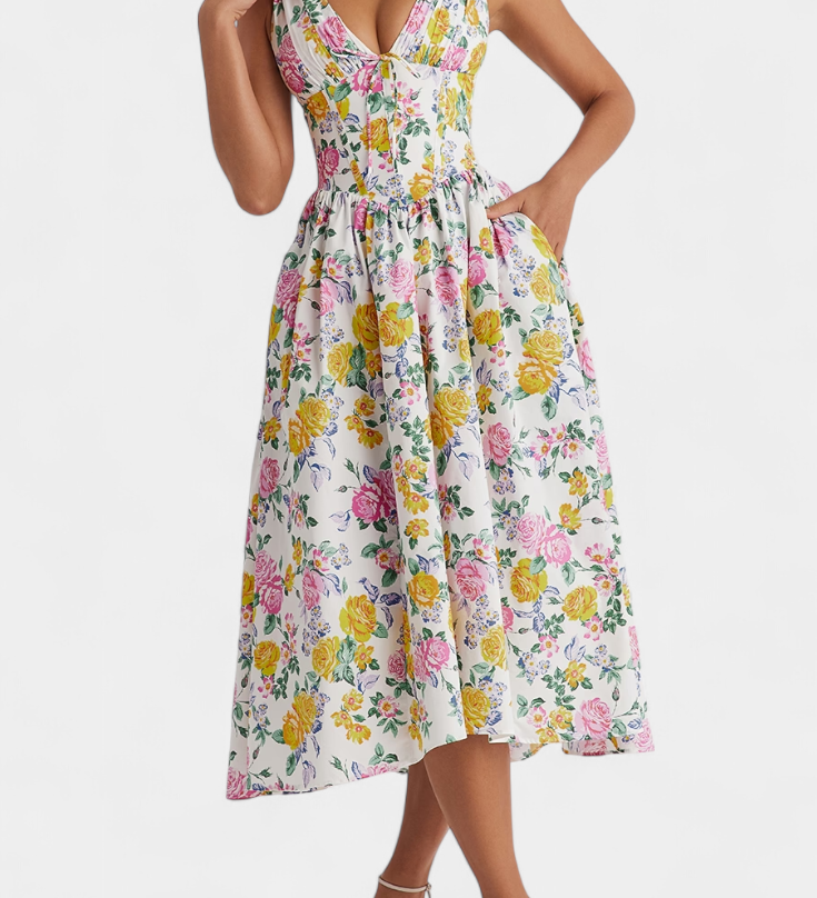 MARGIE – Vestido Midi de Escote en V y Estampado Floral Romántico