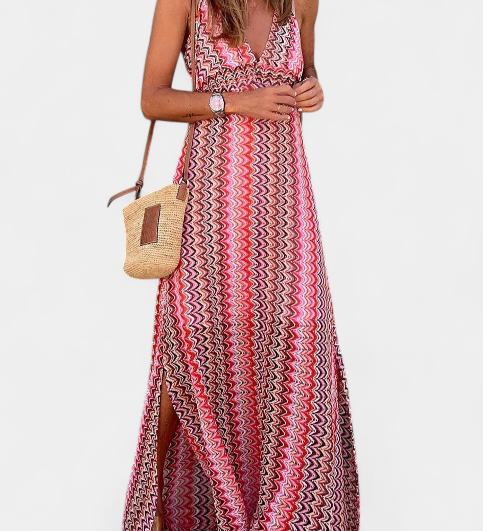 JENI – Vestido Largo Boho con Escote Halter y Estampado Tribal