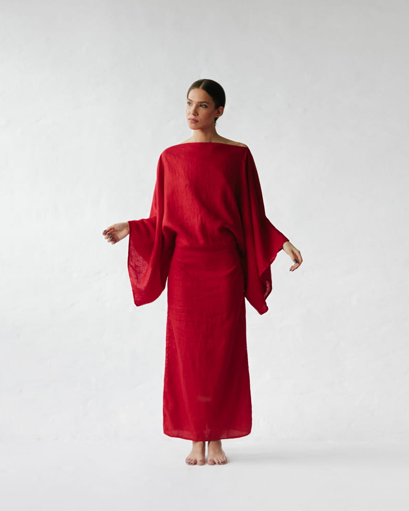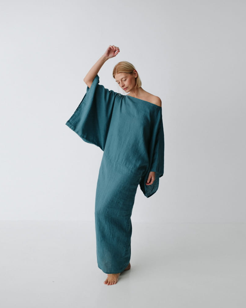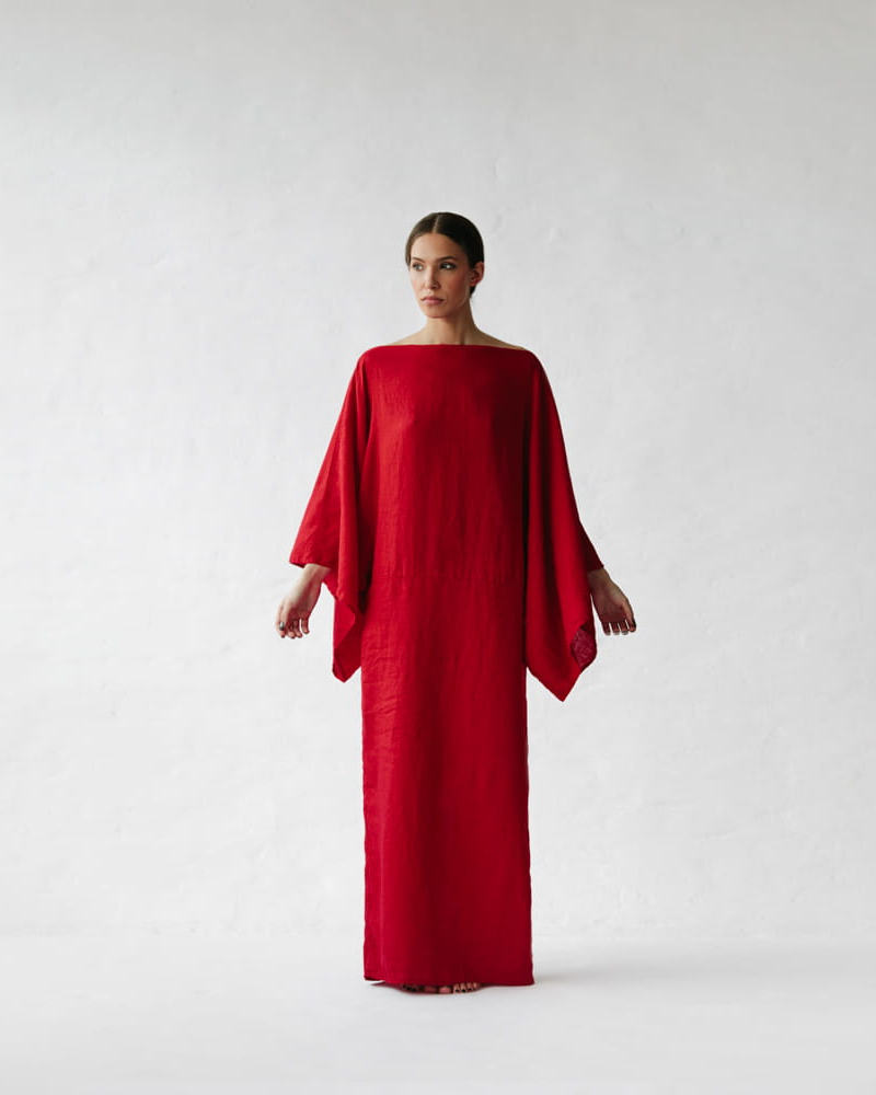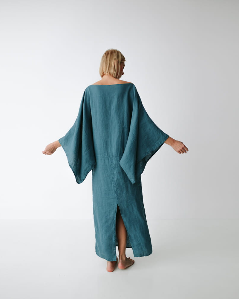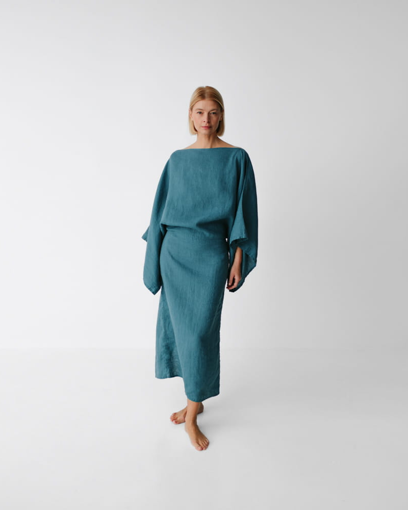 El vestido Noura transmite una presencia serena con su escote barco y mangas murciélago fluidas, confeccionado en lino 100 % transpirable. Su largo midi-maxi, cintura entallada y corte relajado logran un equilibrio ideal entre sofisticación y comodidad ligera.