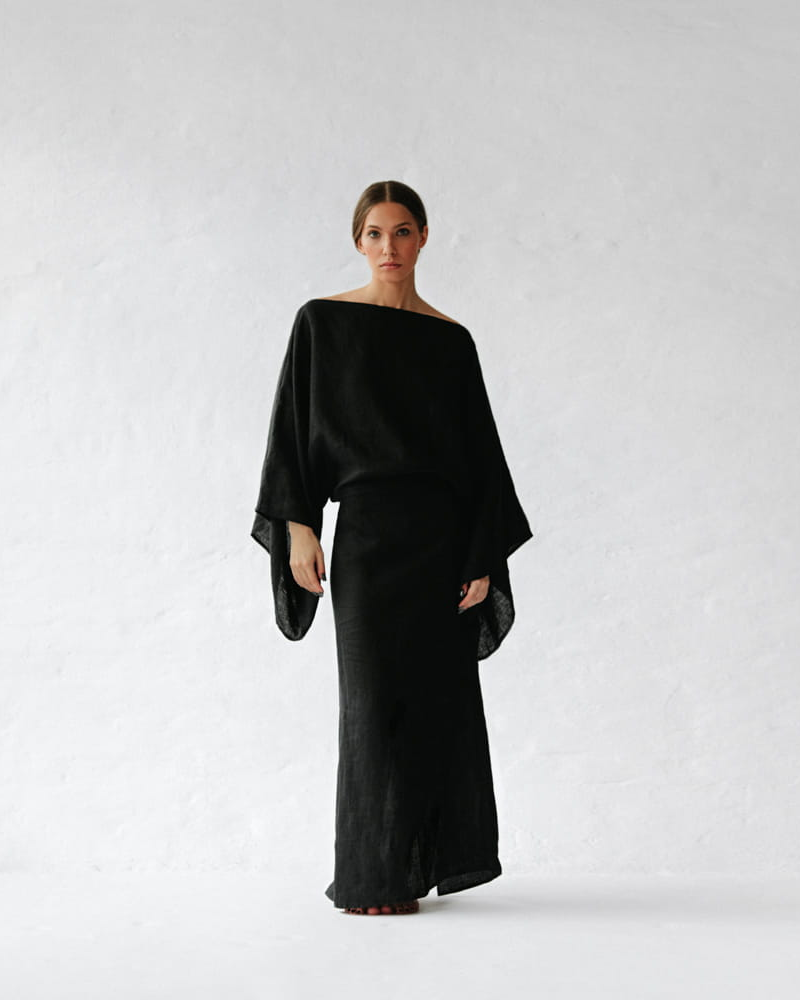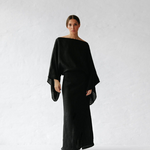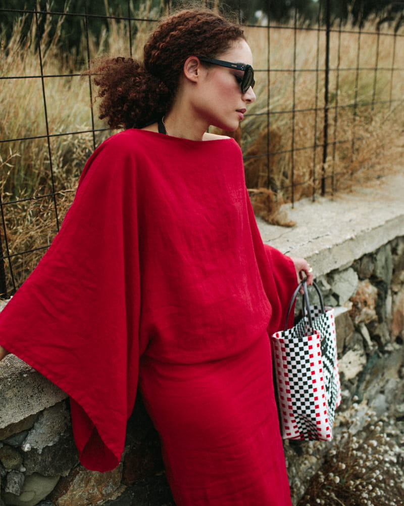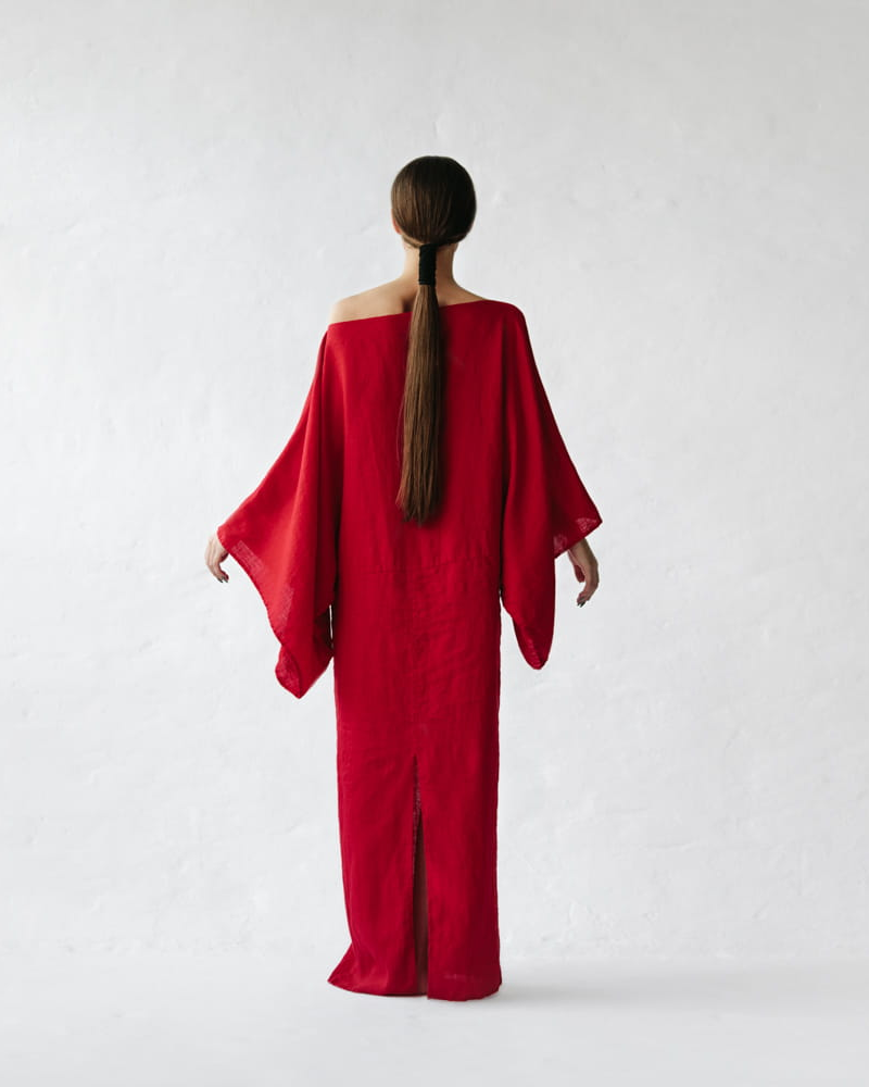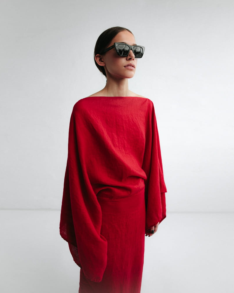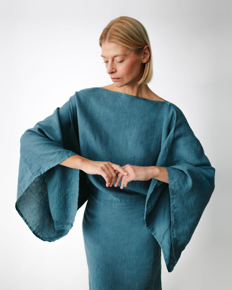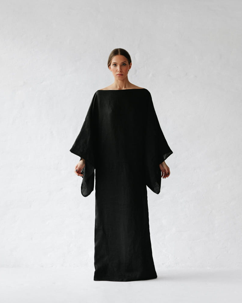 El vestido Noura transmite una presencia serena con su escote barco y mangas murciélago fluidas, confeccionado en lino 100 % transpirable. Su largo midi-maxi, cintura entallada y corte relajado logran un equilibrio ideal entre sofisticación y comodidad ligera.