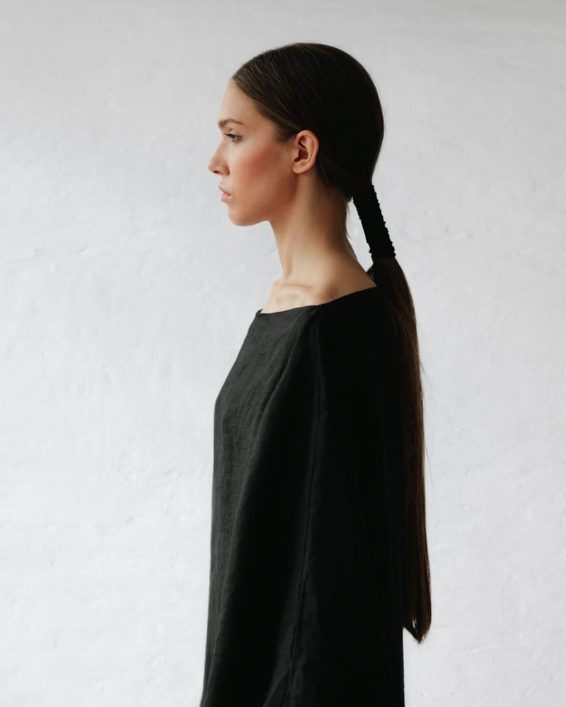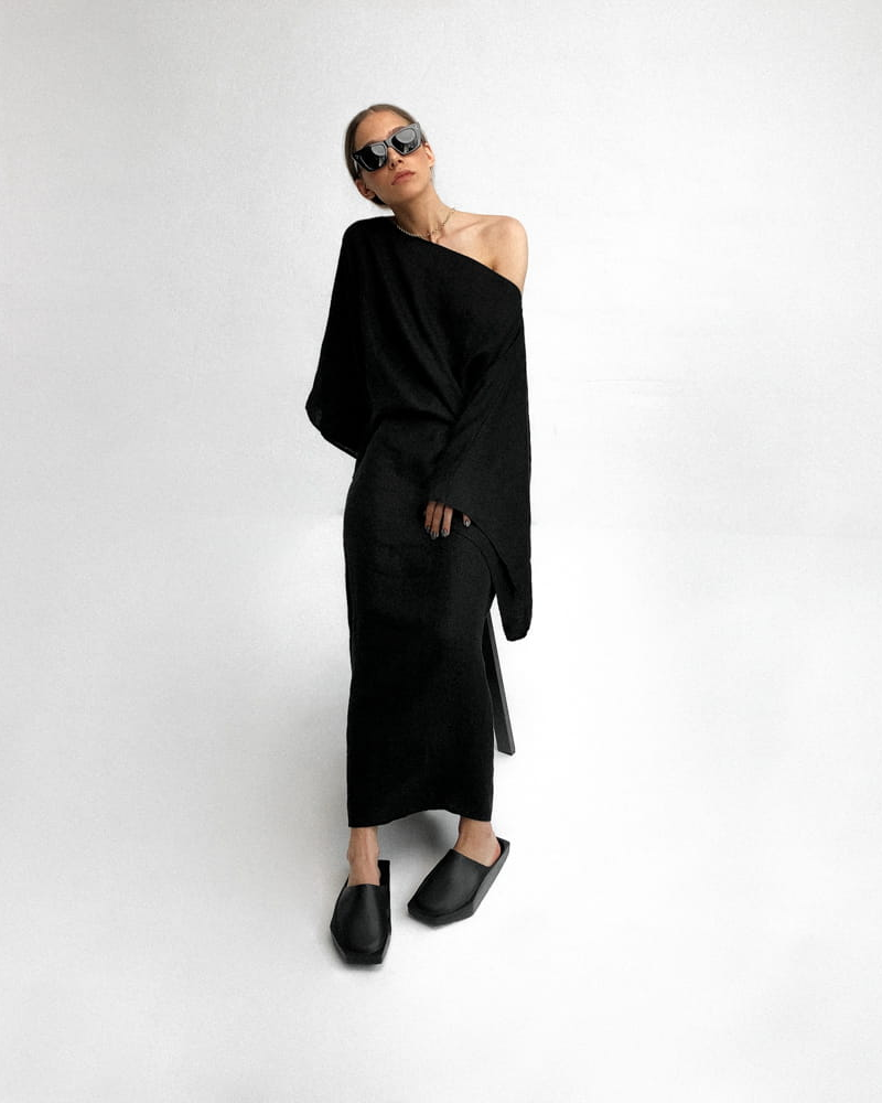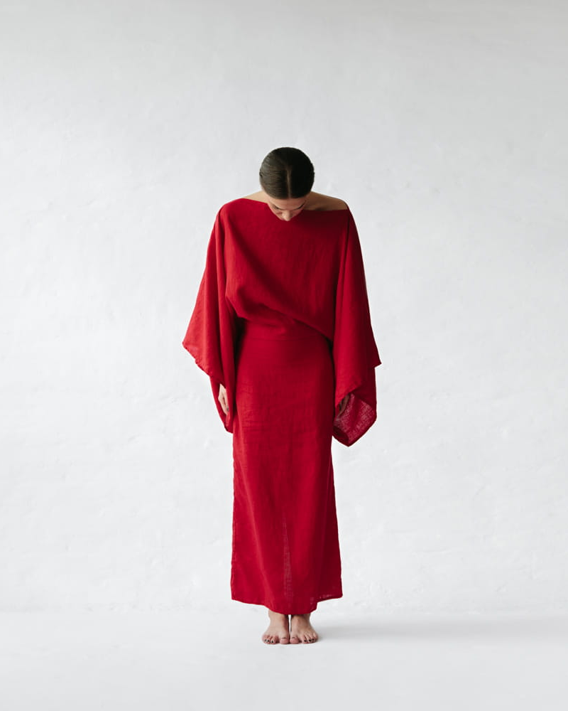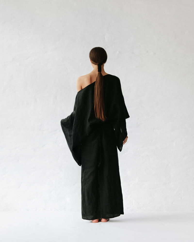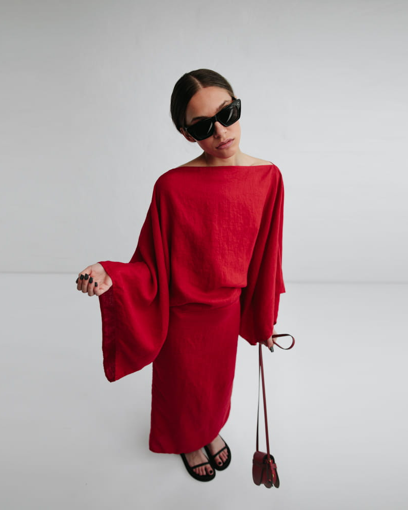 El vestido Noura transmite una presencia serena con su escote barco y mangas murciélago fluidas, confeccionado en lino 100 % transpirable. Su largo midi-maxi, cintura entallada y corte relajado logran un equilibrio ideal entre sofisticación y comodidad ligera.